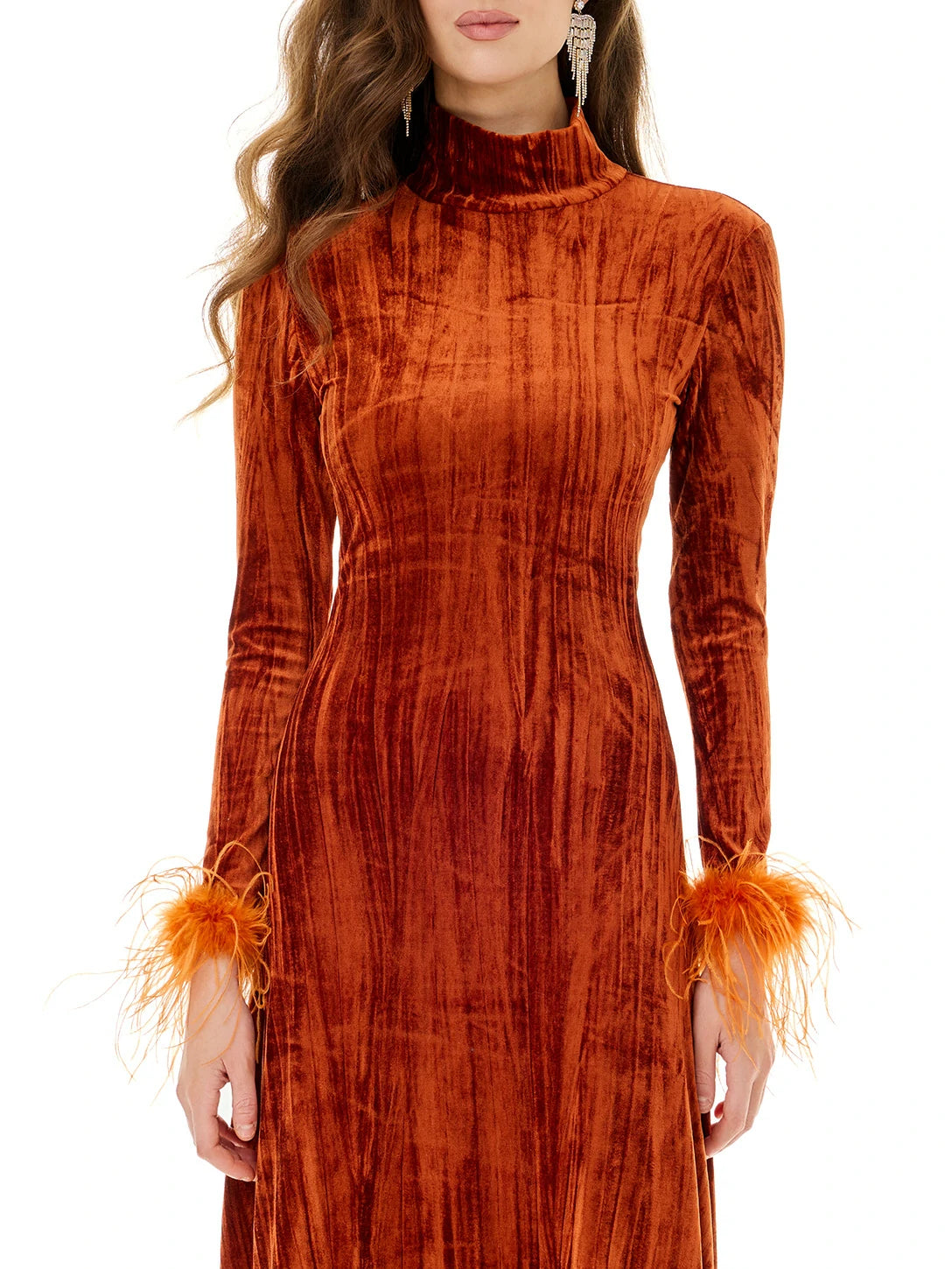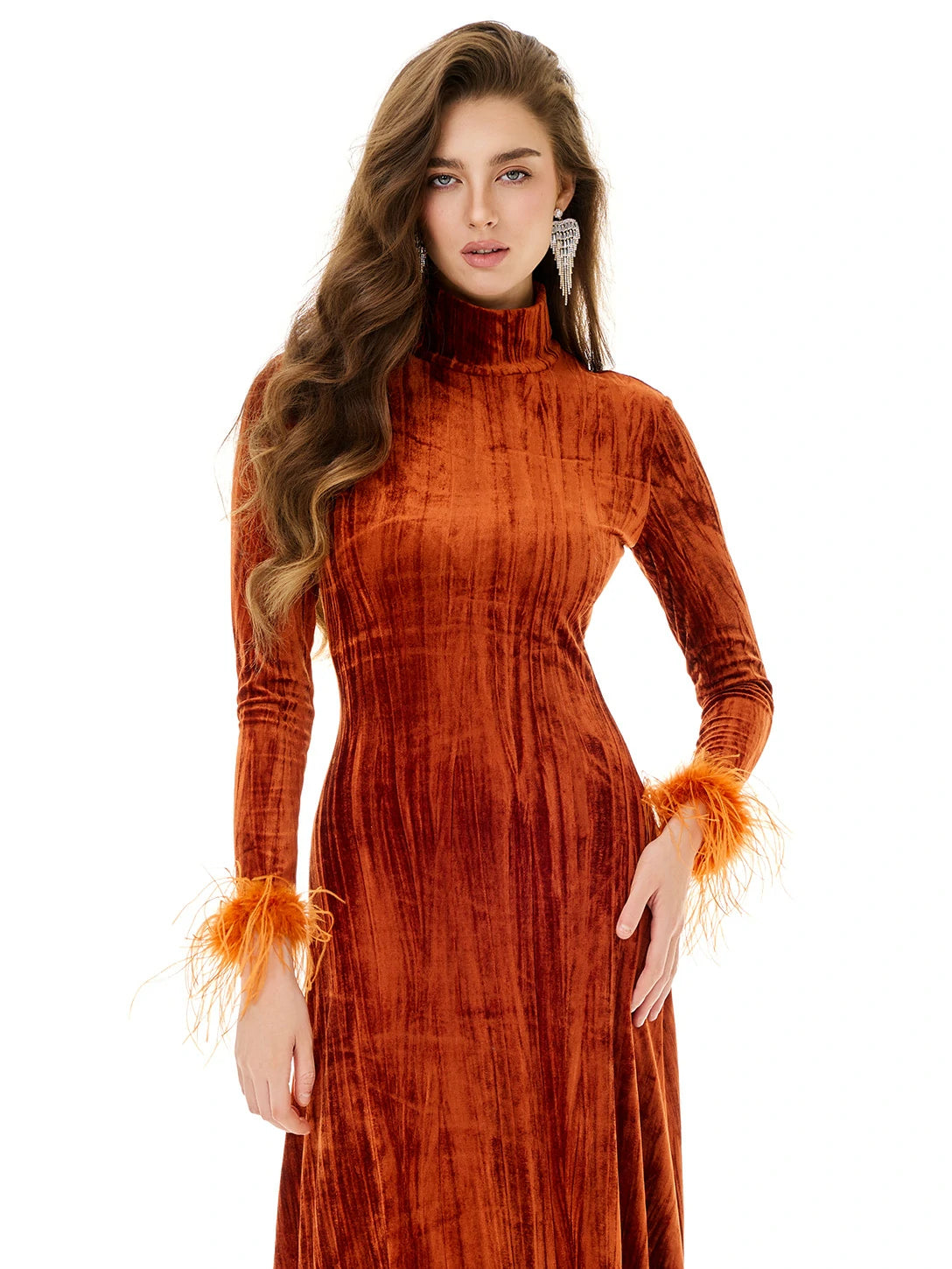 Stand out with luxe velvet and playful feather cuffs. This rust-toned dress hugs the figure and adds elegance to any cocktail hour or formal dinner.
