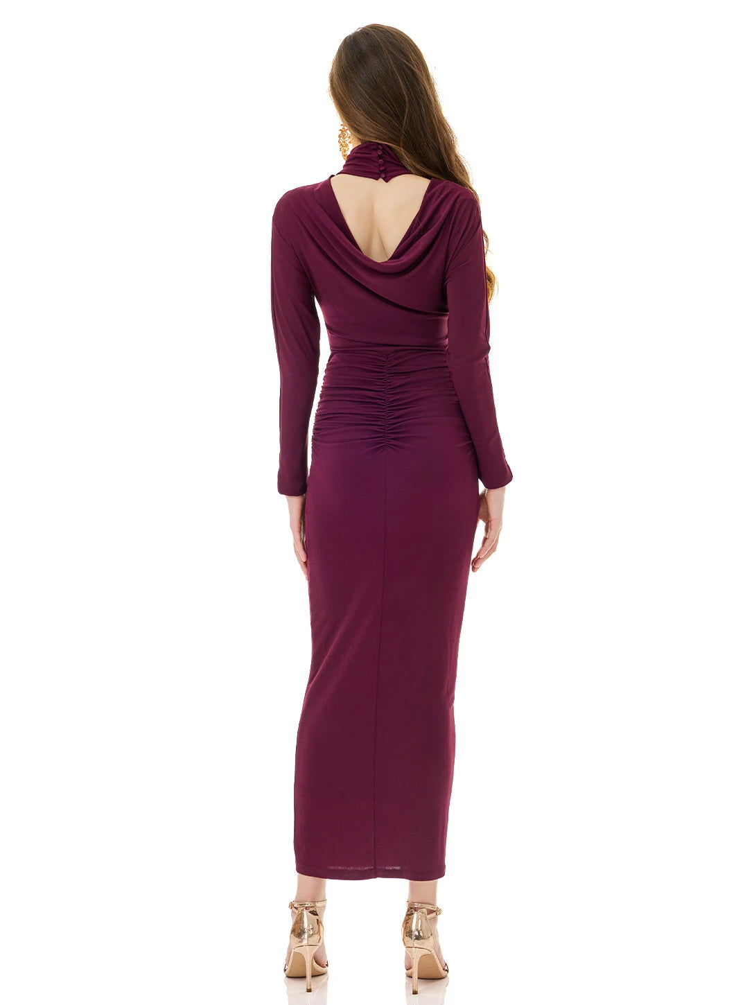 Exude timeless elegance in this wine maxi dress. Its sophisticated high neck and flattering ruching sculpt a beautiful silhouette. Ideal for events, style with delicate jewelry and heels. Elevate your wardrobe.