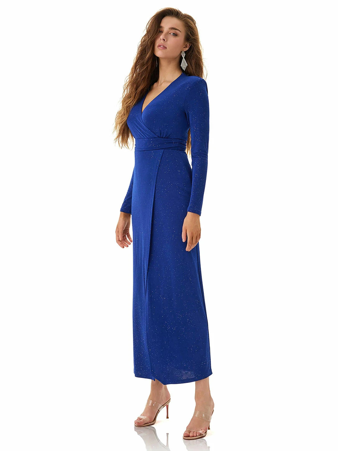Shine bright in vibrant blue. This elegant dress sparkles with every move, making you feel utterly captivating for your unforgettable moment.
