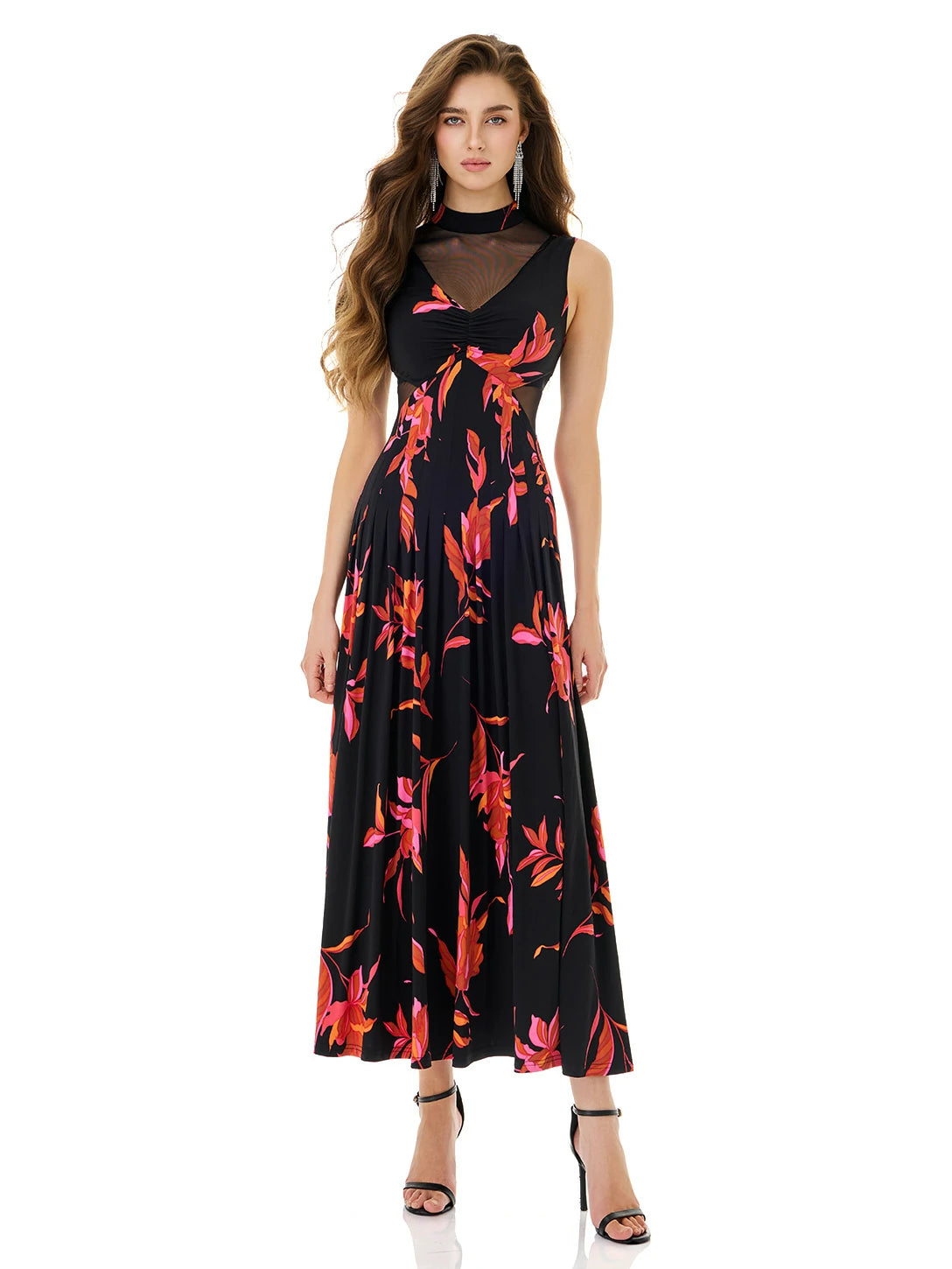 Make a bold statement in this vibrant floral print dress. It features a chic mesh neckline, daring waist cut-outs, and a flowing pleated skirt. Perfect for evening events, simply add heels. Shop this stunning piece.