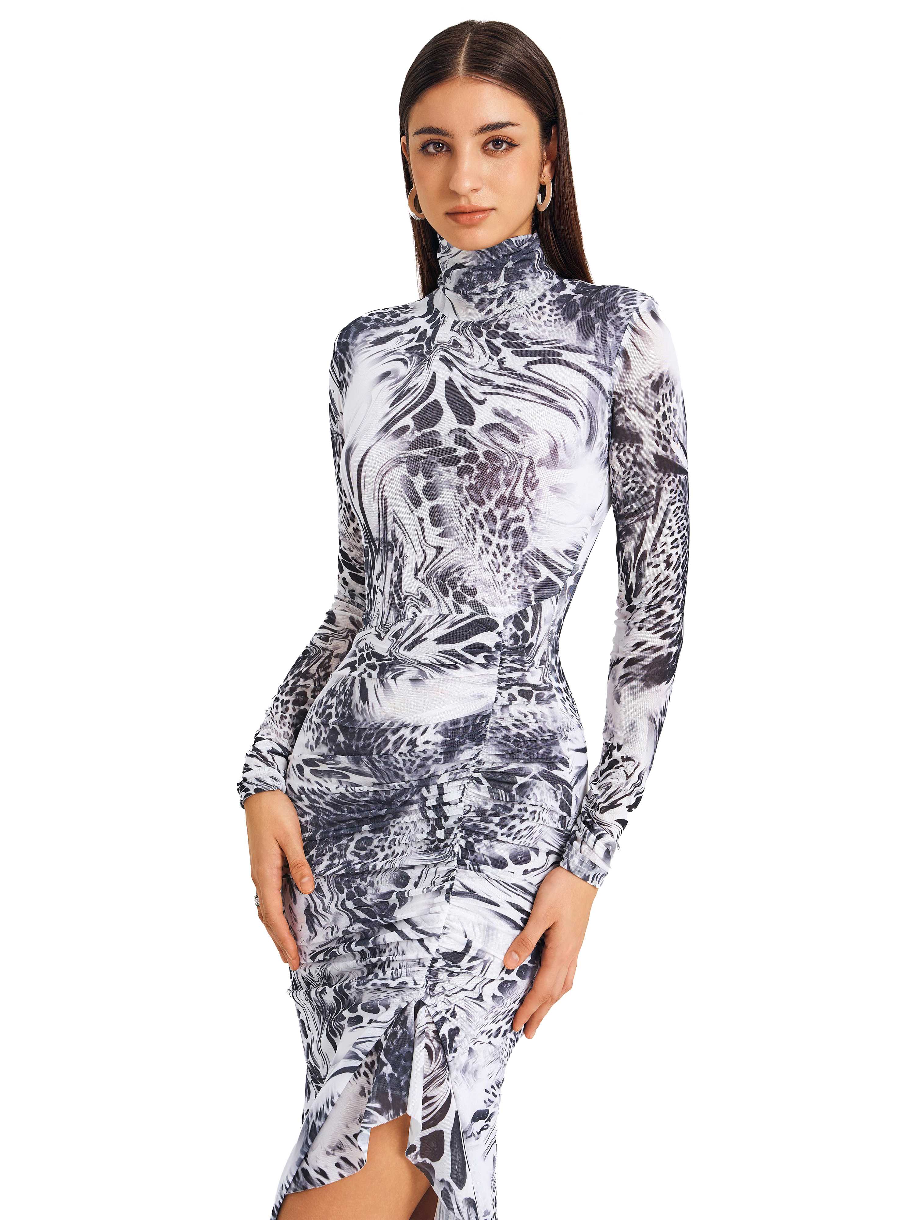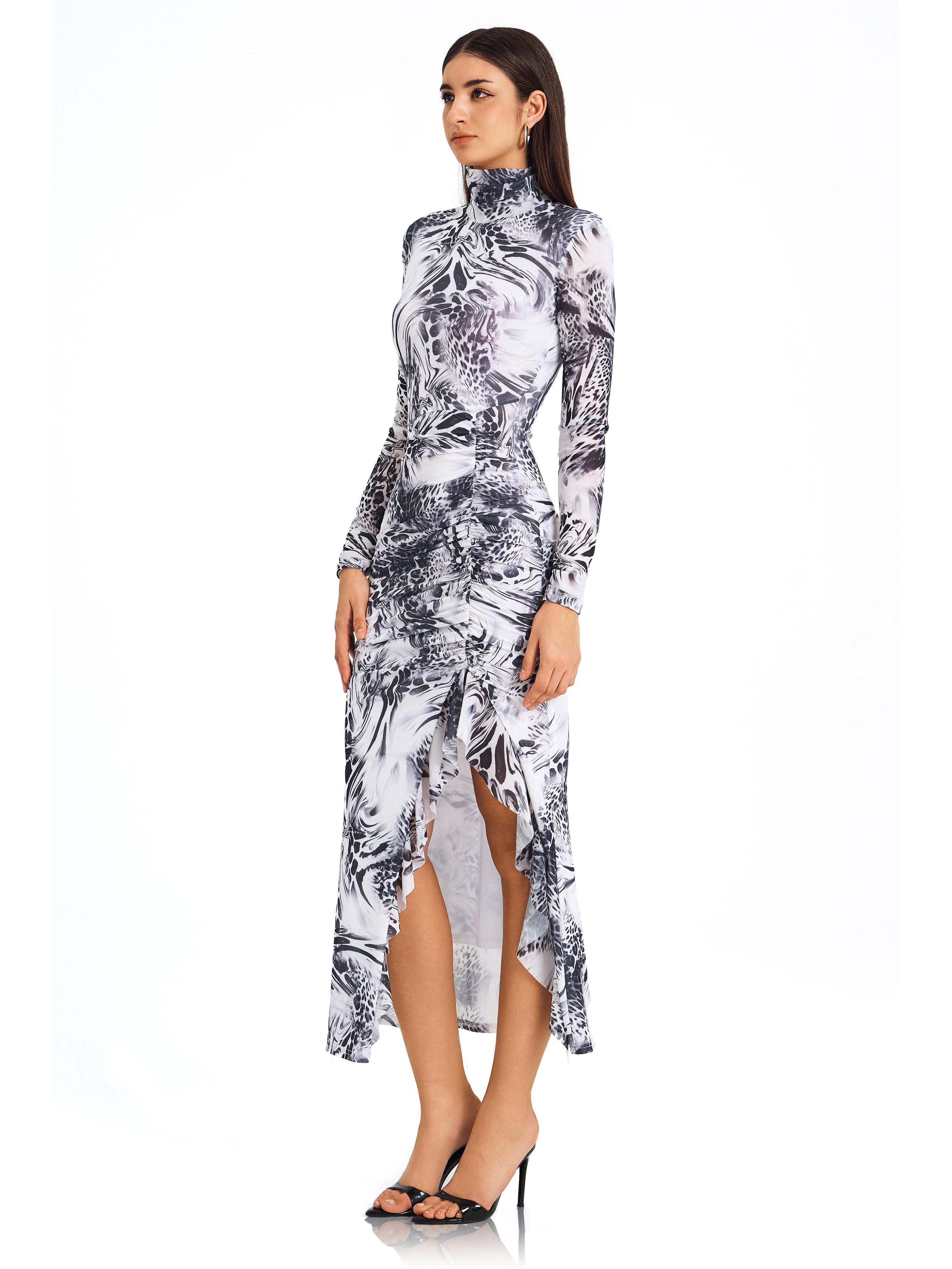 Feel bold & confident. Our unique print fitted dress with high slit flatters curves. Stand out & be unforgettable at any event.
