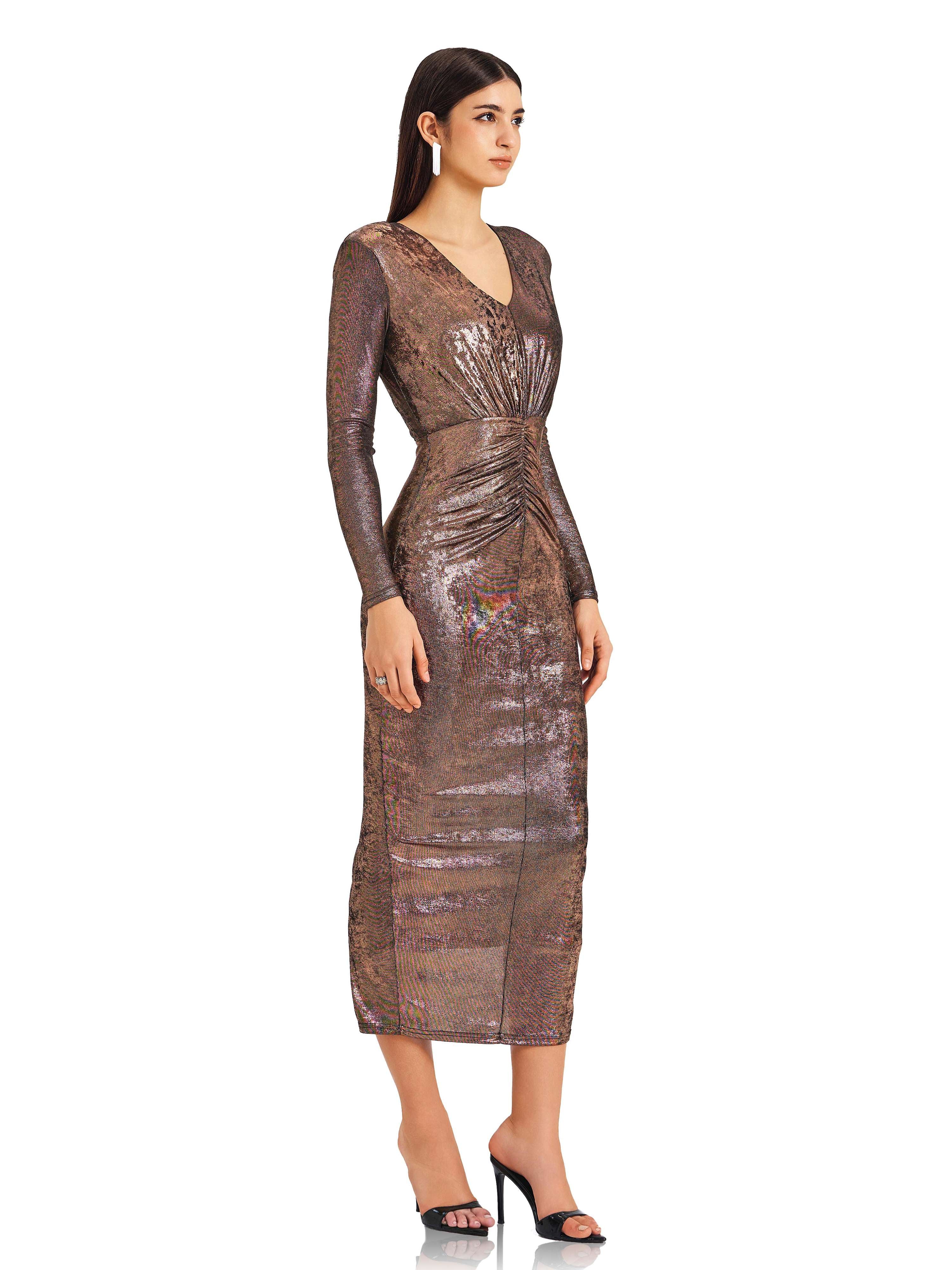 Dazzle in metallic bronze. This fitted dress flatters your curves, making you feel confident & glamorous for any special night. Shine on!